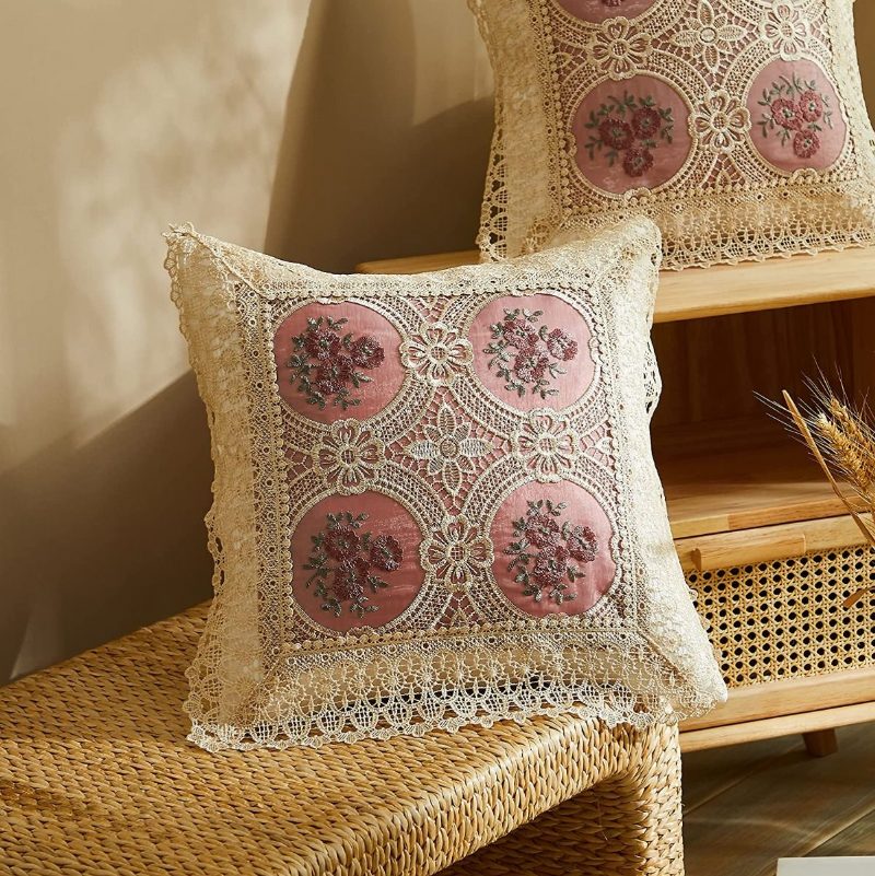 2 Ks Ružové Kvetinové Vyšívané Zlaté Čipkované Obliečky Na Vankúše Ručne Vyrábané Elegantné Na Pohovku 18 X 18 Palcov