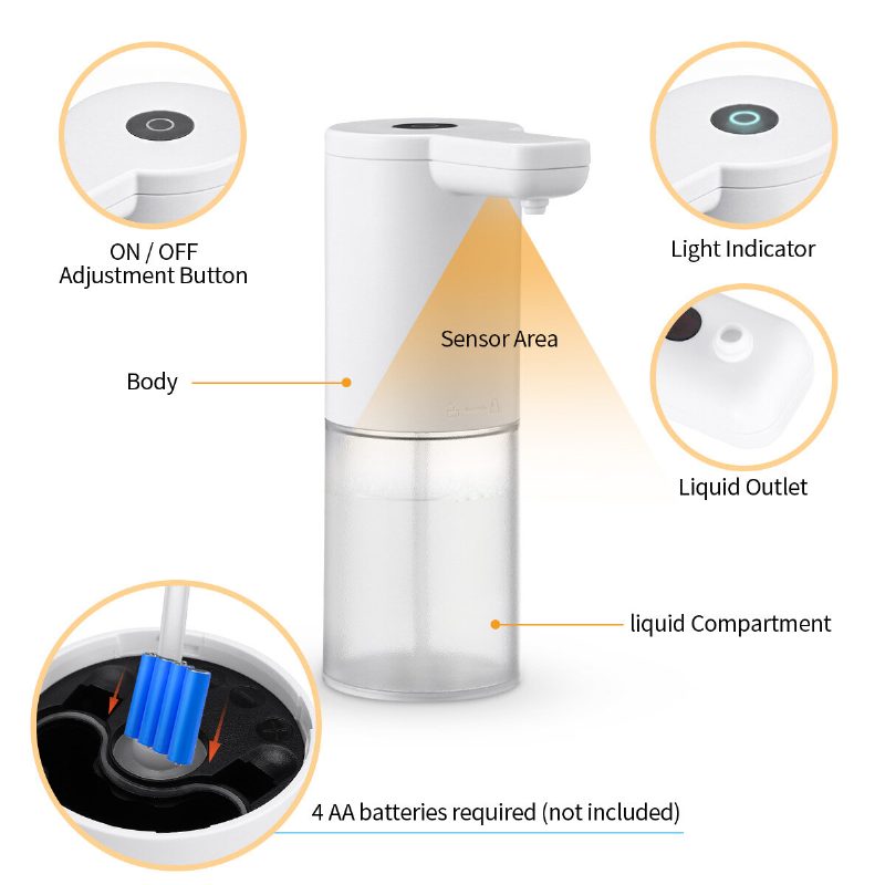 ● Tichý Odpadňovač Kvapaliny: Pre Senzor Automatického Rozprašovania Sú Potrebné Iba 4X Aa Alkalické Batérie (Okrem Batérií). Upozorňujeme, Že Toto Zariadenie Je Použiteľné Iba Pre Tekutý Alkohol. Nepoužívajte Tekutý Alebo Vysoko Viskózny Čistiaci Olej (Ako Je Gélový Dezinfekčný Prostriedok, Šampón, Pena Na Ruky, Zriedený Dezinfekčný Prostriedok Atď.)